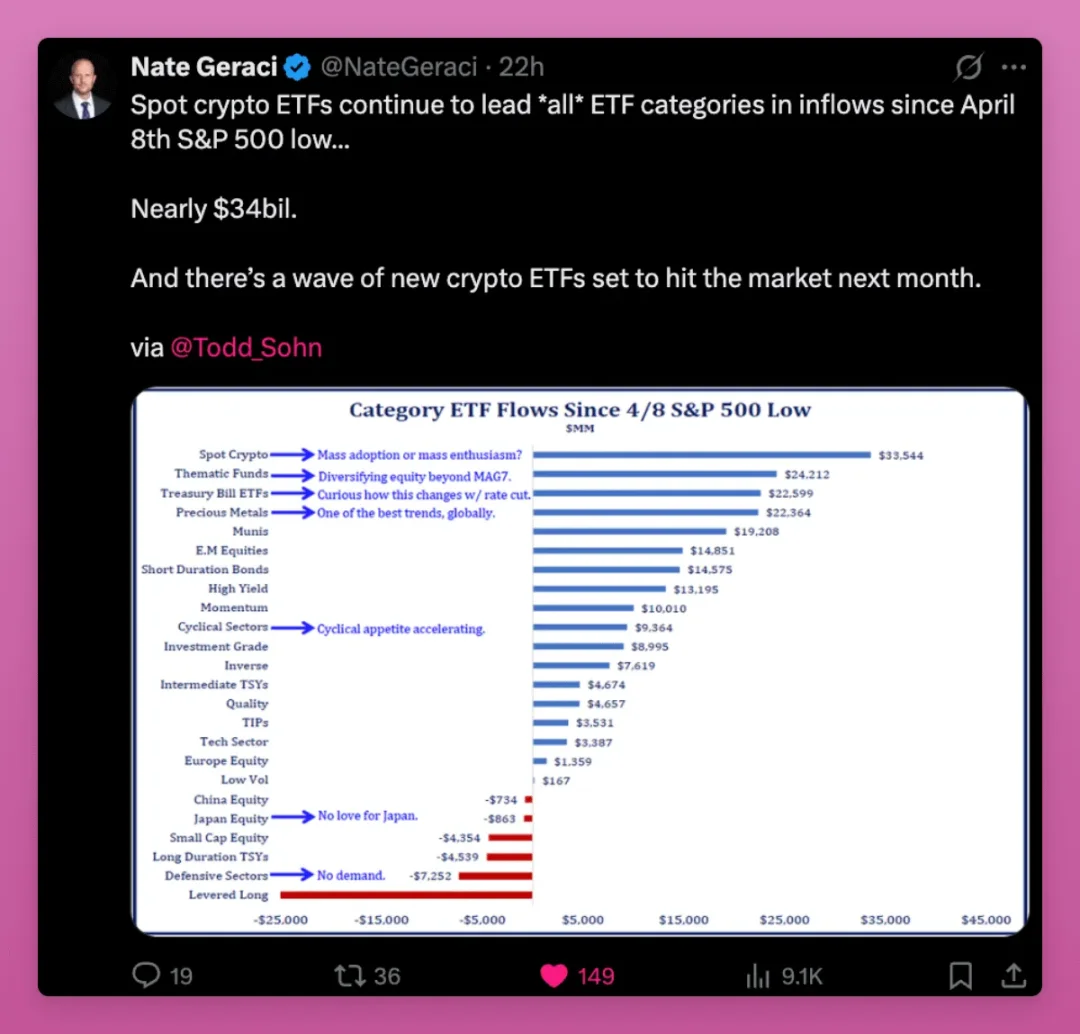 自 4 月 8 日以来,加密货币现货 ETF 的资金流入规模达 340 亿美元,在所有 ETF 类别中位居榜首,超过主题 ETF、国债 ETF 乃至贵金属 ETF
