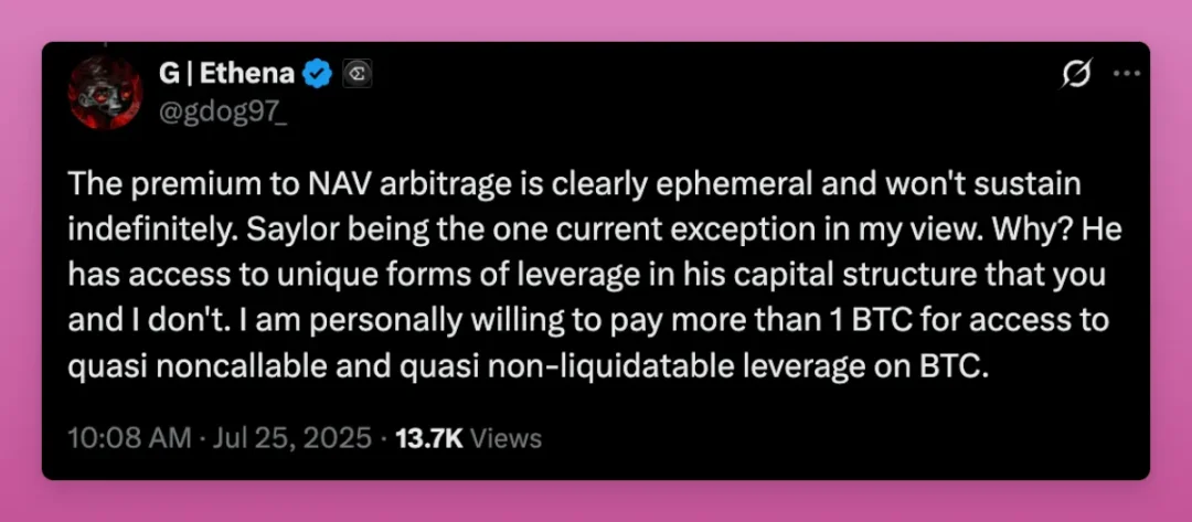 除了 Michael Saylor(MicroStrategy 创始人),多数 DAT 难以维持长期净值溢价。DAT 的真正价值不在于溢价游戏,而在于准入渠道,即便仅能维持 1:1 净值且资金流入稳定,也比完全无法接入股票市场要好。